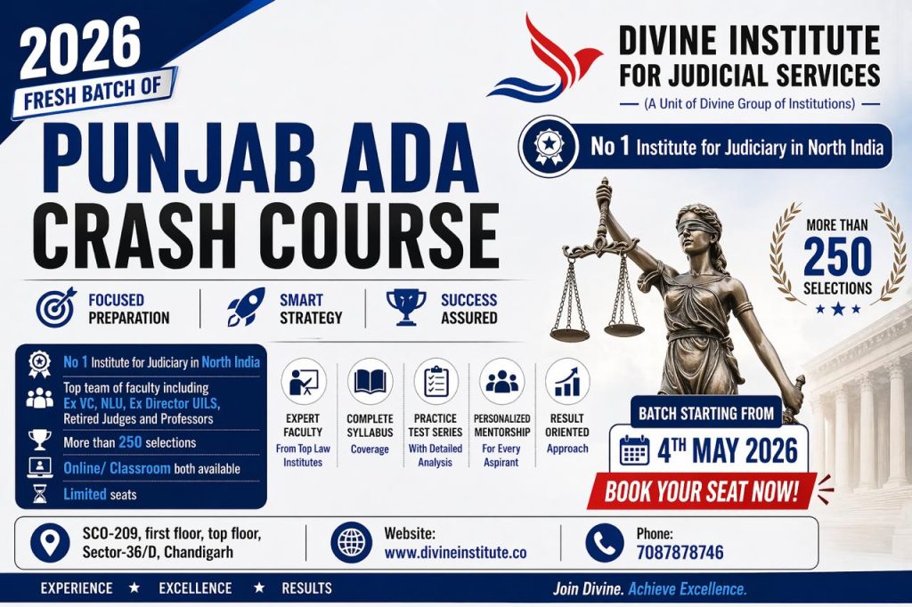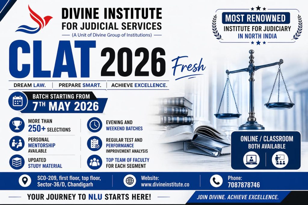 DIVINE Institute for Judicial Services is the No. 1 Coaching Institute in Chandigarh and North India in terms of delivering maximum results with top achievers in Punjab, Haryana, Himachal Pradesh, Delhi, Rajasthan, Jharkhand, Bihar, and Orissa, etc. We offer a classroom course at our Chandigarh Centers.